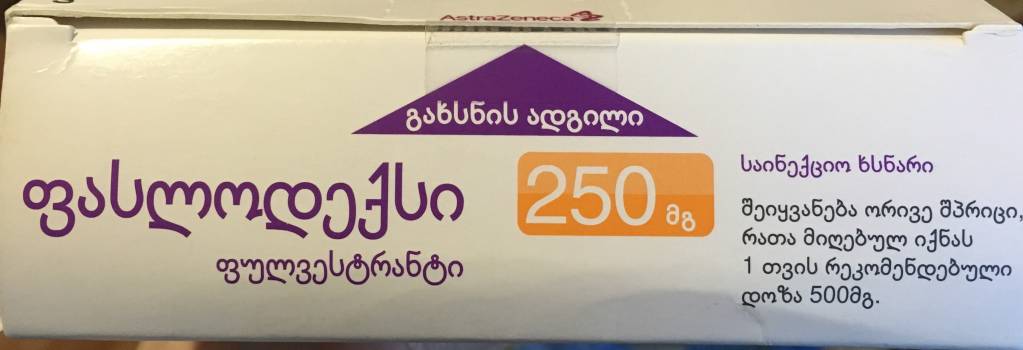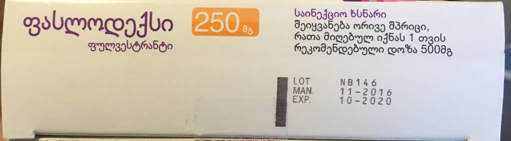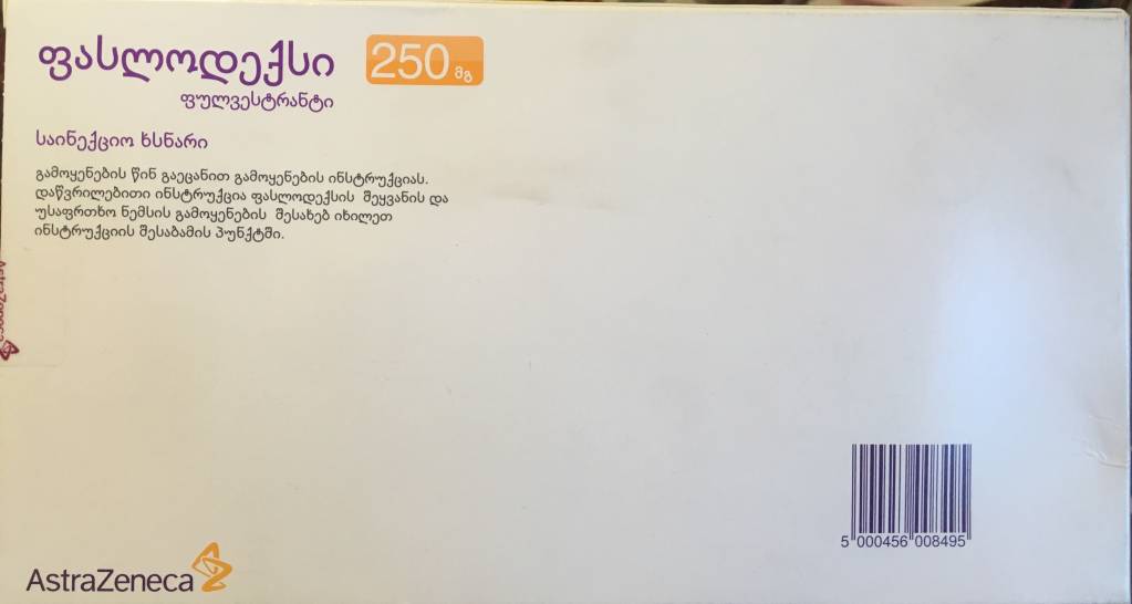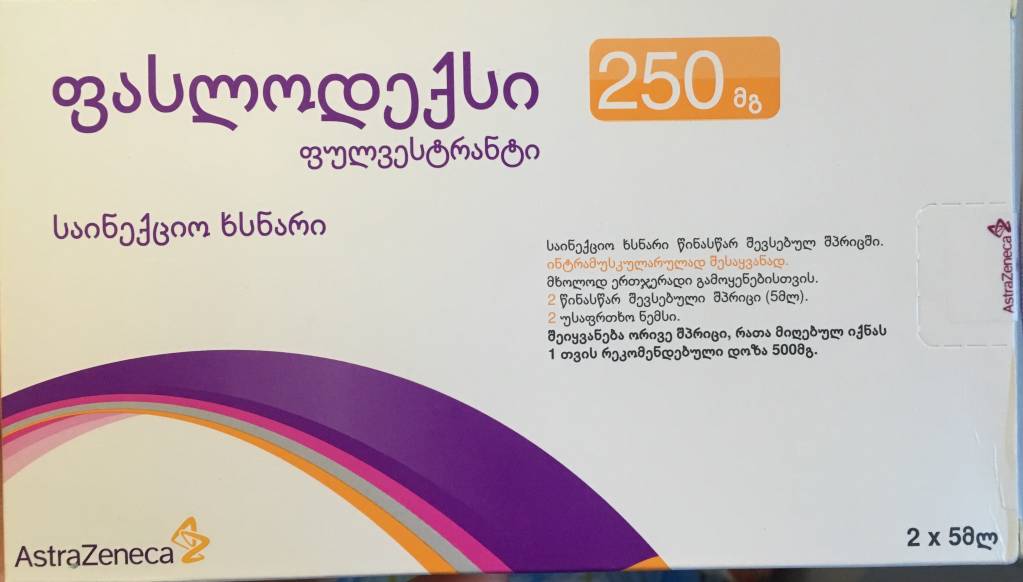 Фазлодекс раствор для внутримышечного введения 250 мг/5 мл, 2 шт. Шприц 5 мл с иглой (2 шт.), упаковка контурная ячейковая, пачка картонная. Производство AstraZeneca UK Ltd. (Великобритания), покупала в Грузии, так как в Москве не нашла. Годен до 2020 года. Осталось 4 не использованных упаковок. Цена договорная.